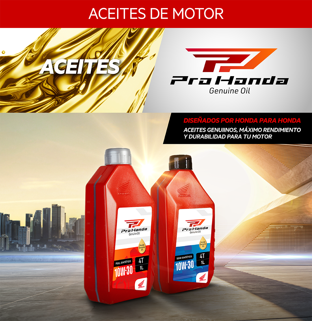 Pro Honda Genuine Oil, es creado por Honda Motor, contiene los mejores aceites de base combinados con agentes antiespumantes y antidesgaste, modificadores de fricción e inhibidores de la corrosión, entre otros,para lograr el máximo rendimiento y brindar la máxima protección para los componentes internos de motor, transmisión y suspensión.